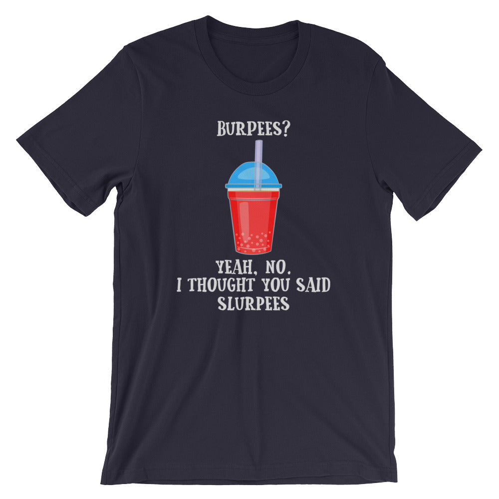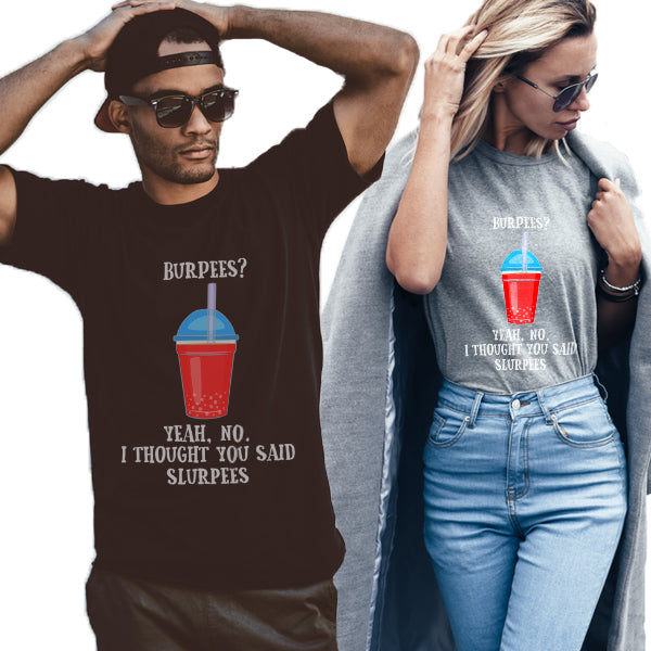 Designed for your favorite gym buddy, body builder and weight lifter with a great sense of humor, this t-shirt features "Burpees? I thought you said Slurpees". Available in Multiple Colors for Men and Women. This tee shirt is a perfect gift for your favorite gym buddy, body builder and weight lifter.