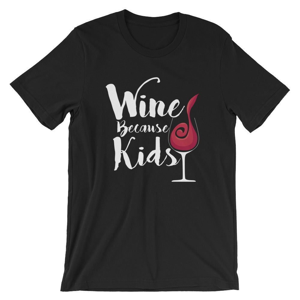 Designed for parents with a great sense of humor, this t-shirt features "Wine because Kids". Available in Multiple Colors for Men and Women. This tee shirt is a perfect gift for your favorite parent or guardian.